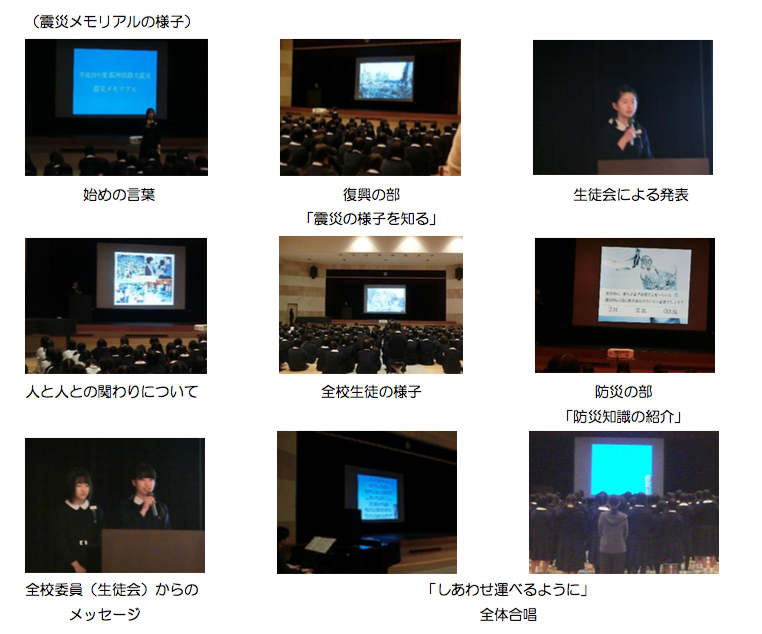 愛徳学園は、阪神淡路大震災で校舎・体育館が半壊するなど甚大な被害を受け、その後の2年間、仮設校舎 での生活を余儀なくされました。震災の記憶を継承し、当時の経験から『いのち』について深く考える機会と して、全校委員(生徒会)主催の「震災メモリアル」を毎年 1 月 17 日に実施しています。