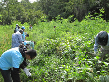 中高生の有志による「環境大使」も活動しています。「きずきの森」での保全活動や、丹波篠山での黒豆畑作体験などさまざまに活動しています。黒豆づくりでは、無農薬栽培を行う農家の方から指導を受けます。生徒たちは獣害の話を聞いたり農業について聞いたり、机上では学べないことを農家の方から学んでいます。
