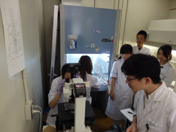 徳島大学医学部との連携では、臨床診察練習として、モニターを通しての腹腔鏡手術の疑似体験や講義などを受けています。総合科学部でも「食品の大腸菌検査」などの講座を設置しています。