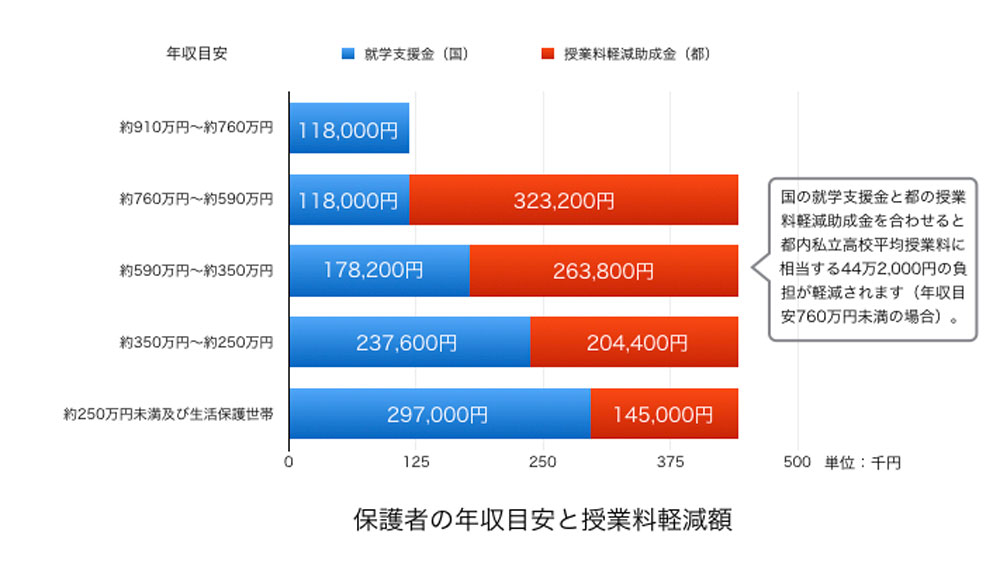 まず、国の就学支援金は年収別に11万8,800円から29万7,000円が支給されます。この金額と私立高校の授業料平均額44万2,000円との差分を支援するのが東京都の授業料軽減助成金で(年収によって14万5,000円から32万3,200円)、年収目安760万円未満の世帯の場合は、授業料が実質無償となるわけです。