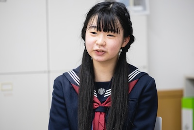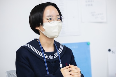私は人前で話すことやプレゼンテーションをすることが好きで、誰かに何かを伝えるということに興味があります。中学生のときに学校説明会に参加して、生徒がアグレッシブに発言しているのが印象的で、カッコ良かったんです。それで、私も入学したらやってみたいなって。お母さんとそう話していたことを覚えています。生徒インタビューも他の学校と比べて和気あいあいとした良い雰囲気で、何より事前に作られた感がないのが良かったです。