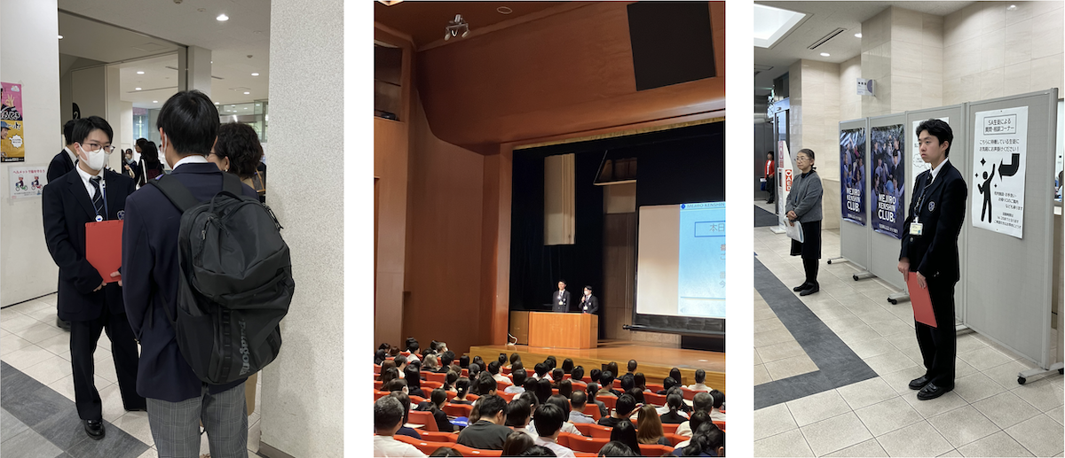 ▶︎SAの活動:説明会で参加者の質問に答える(写真左) 会場で今後の説明会の流れを案内(同中央) SAブースで参加者を待つ(同右)
